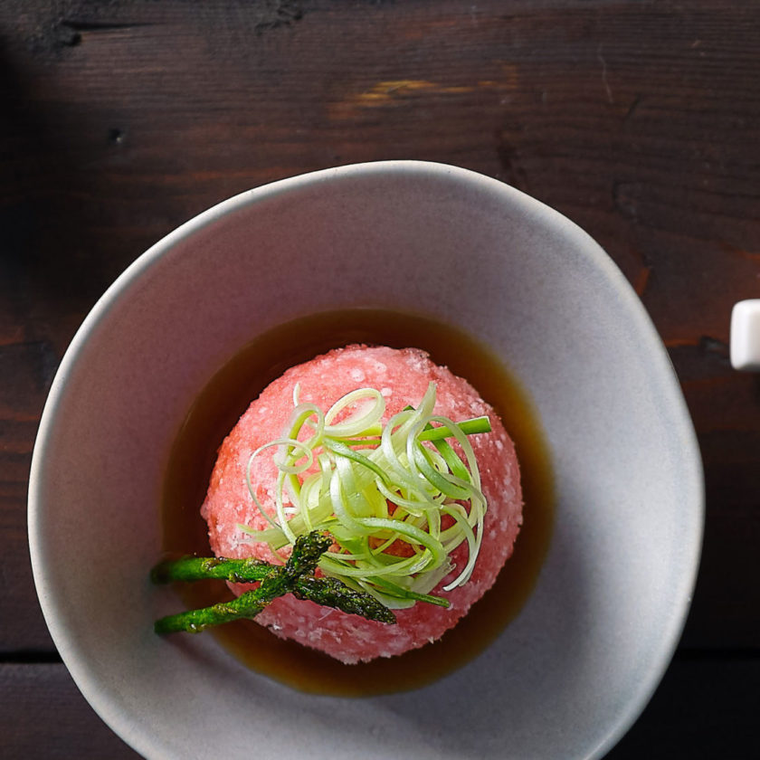 - Plate the tomato and asparagus in a shallow bowl, and add the agedashi sauce to serve.