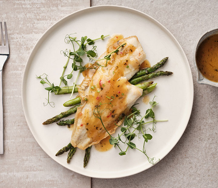 - Serve with pan fried seasonal vegetable and garnish with pea shoot