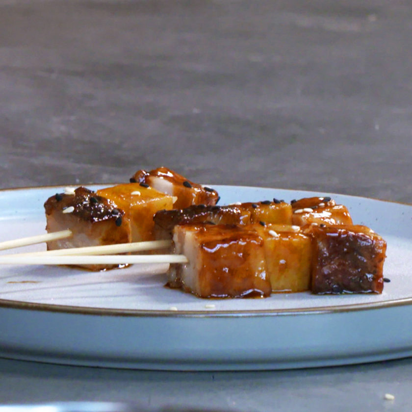 Soft and sticky pork skewers glazed in an irresistible savoury-sweet sauce - a Japanese street food classic.
