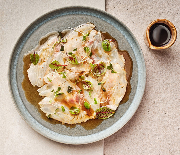 - Thinly slice the seabass and lay onto a plate in to create a rounded shape