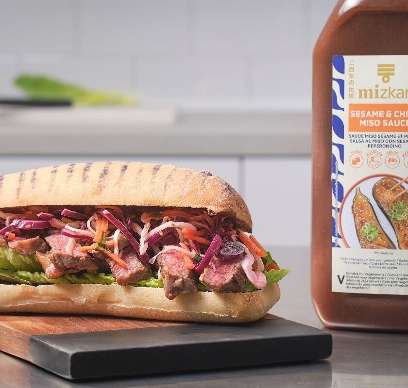 This is a steak sandwich with a delicious twist! Made with Mizkan Sesame & Chilli Miso Sauce, it has a chilli kick and smoky, nutty tones that make it a must-try addition to any lunch or dinner menu.